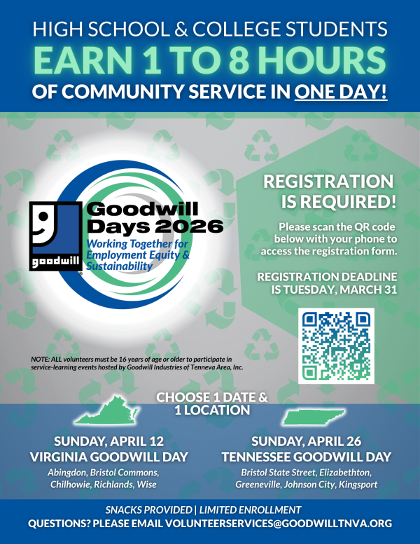 Registration for both Goodwill Day Virginia and Goodwill Day Tennessee is now open. Goodwill Day observances at Goodwill Tenneva locations aid students needing community service to meet financial aid, scholarship, course, work ethic, graduation, college/work application, or résumé requirements. High school and college students in Southwest Virginia and Northeast Tennessee who are age 16 plus can earn one to eight hours of community service on either April 12 at our Virginia stores in Abingdon, Bristol, Chilhowie, Richlands, and Wise or on April 26 at our Tennessee stores in Bristol, Elizabethton, Greeneville, Johnson City, and Kingsport. Registration for a limited number of available volunteer slots at each location is required. The deadline to register is the same for either state option, March 31 by 7:00 p.m.